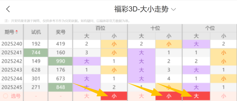 上期开奖号码848,形态为组三,大小比为2:1,单双比为0:3,跨度为4,和值20。
