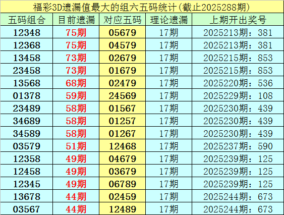 1.截止第25288期,五码组六遗漏最大的是:12348、12368,当前遗漏75期。