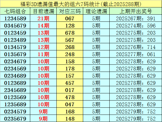 1.截止第25288期,七码组六遗漏最大的是:1234589,当前遗漏21期。