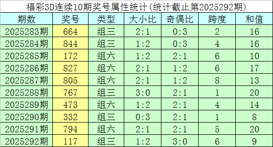开奖回顾:福彩3D第2025292期奖号为117。奖号形态为组三,大小形态为小小大,奇偶形态为奇奇奇,和值为9,跨度为6。