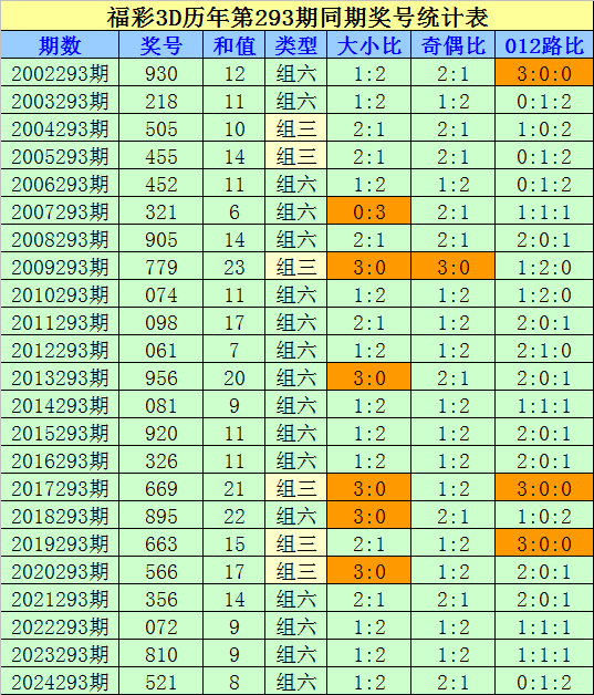 组选类型判断:在第293期历史同期开奖中,组六开出17次,组三开出6次,今年同期看好开出组六号码。
