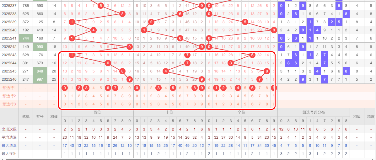 上期百位开出9,本区与上期的跨度为1,本期我们可以从上面走势图中看出选号的思路,本期百位推荐关注:02367