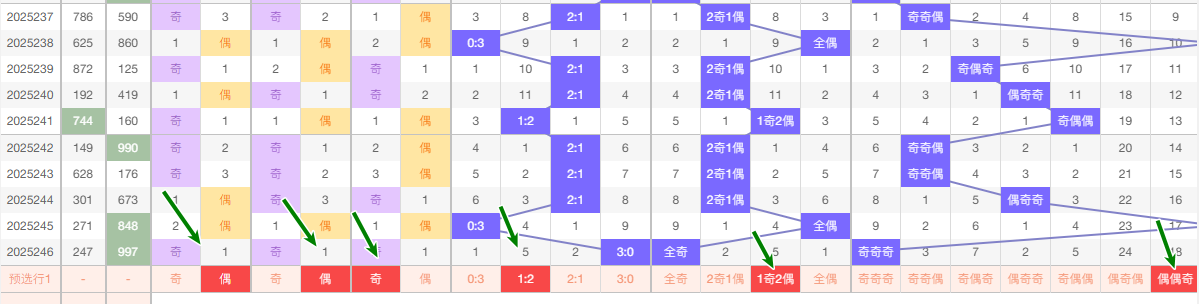 (二)、奇偶分析 奇数 13579 偶数 02468 在这5期 数据中 奇数出现 9次 偶数出现 6次 从昨天出号来看奇数占优, 本期还是看好偶数有号 看好 奇偶偶 奇奇偶