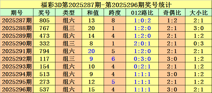 开奖回顾:第2025296期福彩3D奖号为537。