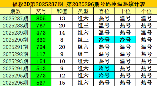 上期回顾:福彩3D第2025296期开奖奖号为:537,奖号类型为:组六,奖号冷温热态为:热号+热号+热号。