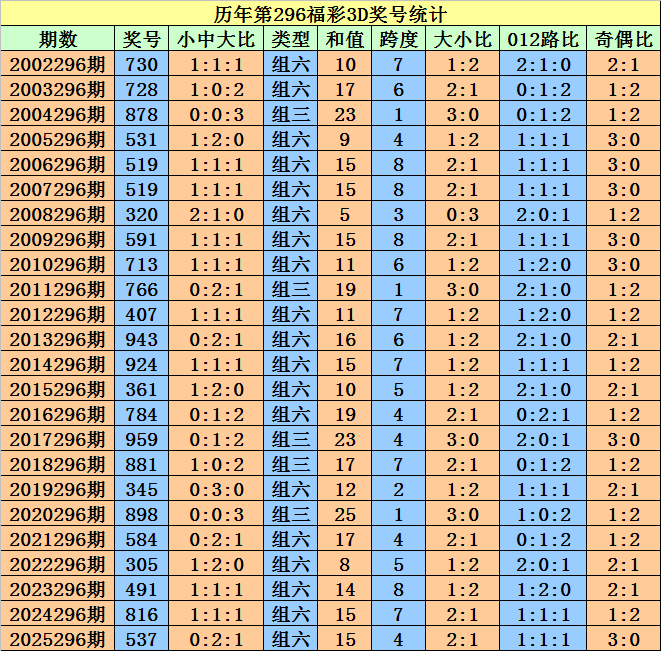 开奖回顾:福彩3D第2025296期奖号为:537。
