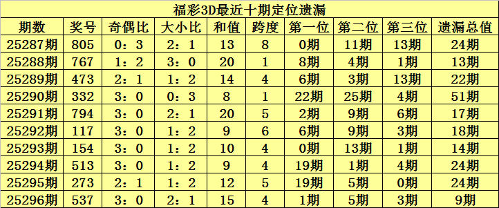 开奖回顾:福彩3D第2025296期奖号:537,百位号码遗漏1期、十位号码遗漏5期、个位号码遗漏3期,遗漏总值为9期。
