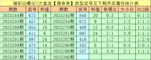 前7次出现偶奇奇类型奖号分别为:673、457、055、411、897、473、273,其下期分别开出奖号:848、072、408、897、416、332、537。