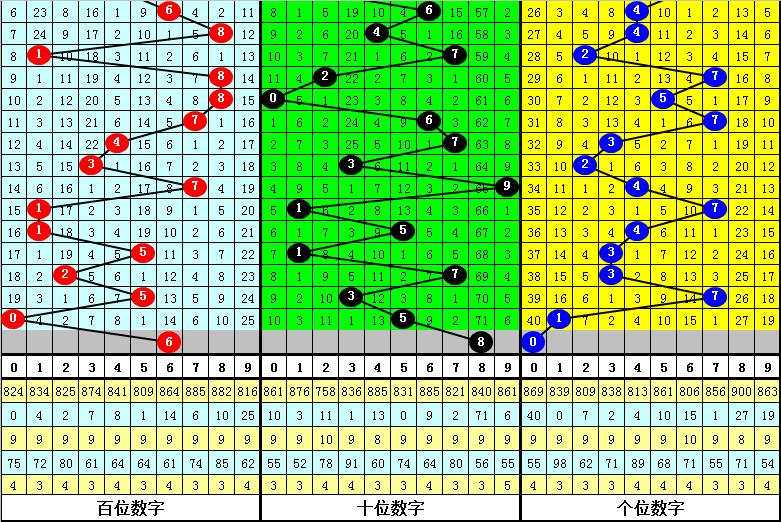 百位上期出现:冷号0,该位连续十期以冷号出现较多,以热号、温号出现较少,本期该位温号有5个:3、4、6、7、8,看好温号转热,关注号码6。