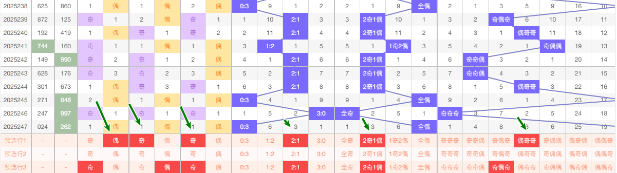 (二)、奇偶分析 奇数 13579 偶数 02468 在这5期 数据中 奇数出现 7次 偶数出现 8次 从昨天出号来看奇数占优, 本期还是看好偶数有号 看好 奇偶偶 奇奇偶