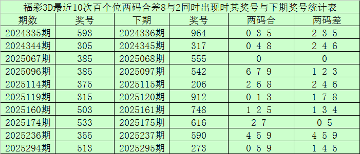 百个位合差分析:上期奖号百个位开出35组合,两码合为8,两码差为2,最近10次百个位两码合8与两码差2同时出现时,其奖号和下期奖号分别为: