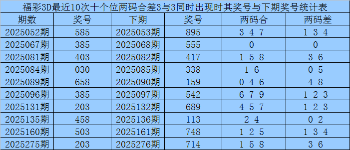 十个位合差分析:上期奖号十个位开出85组合,两码合为3,两码差为3,最近10次十个位两码合3与两码差3同时出现时,其奖号和下期奖号分别为: