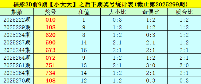 5、在下期奖号中,号码大小比为:0:3、1:2、1:2、2:1、2:1、1:2、2:1、1:2、1:2,号码大小比总比例为11:16,本期预计大号活跃,关注大小比2:1。