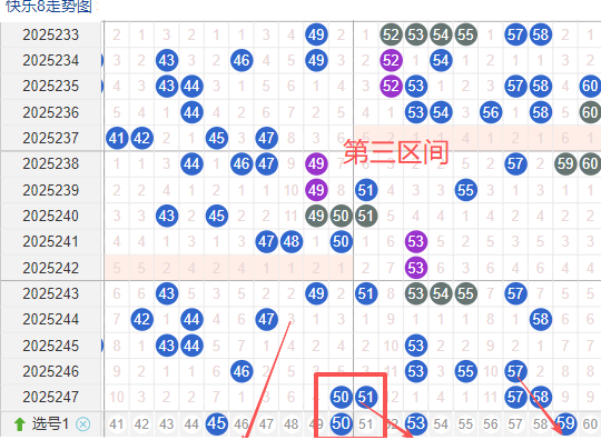 三区间开出了4个奖号(50.51.57.58.)上期回顾三区开出4个奖号上期的三区间的奖号数量呈现一个不变的形态,4头断号,5头回补4个,本期先来看号码45近期出现频率相对来说是比较热的一个号码。偶尔有时间隔期数也是很长,说明其在近期的开奖中较热,号码50在近 30 期内出现次数不是很稳定得,间隔上来说也不是很好。号码53有一定的间歇性,通常间隔5-3期会出现一次,有明显的连续出现态势,走势相对较热,在整个第三区间的表现可以防守的。号码59近期走势相对近期比较冷,近期没有连续间隔落号的情况,活跃度近期处于跳跃态注意防守。