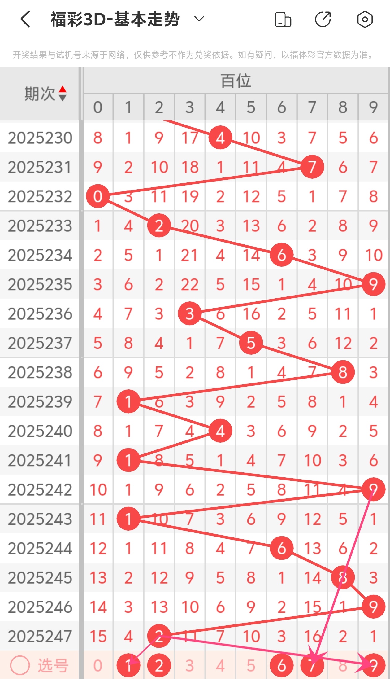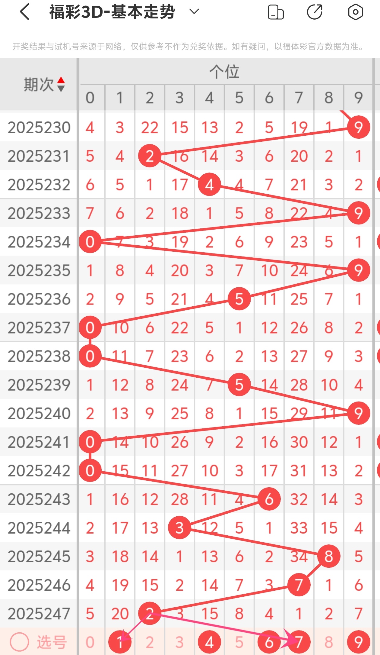 上期个位开出2,本区与上期的跨度为5,本期我们可以从上面走势图中看出选号的思路,1为分边走势跨度为一,7为隔期回补走势跨度为五,综合以上分析,本期个位推荐:14679