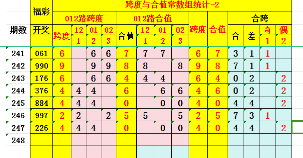 将合值与跨度分别设定为0147258、0147369、0258369三个常数组,常数组的设定,旨在将彩票号码可能出现的合值与跨度范围进行系统分类,为后续的数据分析提供基础;为了规范合值数据的分析维度,结合往期开奖跨度及合值的数据,构建一个数字表格,通过对历史数据的长期积累与持续分析,能够更精准地把握跨度与合值的变化趋势,从而有效压缩投注号码范围; 观察以上数据,