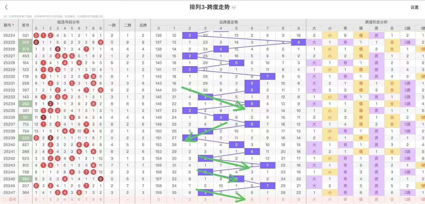 10期内跨度走势为:3-2-5-6-3-7-3-5-7-3,10期内大小跨比:5:5,奇偶跨比8:2,百期内跨度3共开出的14次,下期数据:5 3 5 3 5 5 5 6 4 6 2 7 5 近期度较热,考虑跨度3开出后容易出大跨度,近期大小规律下大:奇:质,所以接下来继续大跨,奇跨度表现!