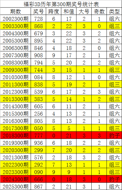 从以上统计可以看出,历年3D第301期开出了4次组三号码,开出了19次组六号码。组六号码出现概率大,本期预计开出组六号码。