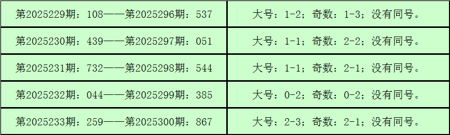 所以,3D第2025300期开出奖号:867,其大小比为3:0,奇偶比为1:2,012路比为1:1:1,与3D第2025301期奖号可能有同号。