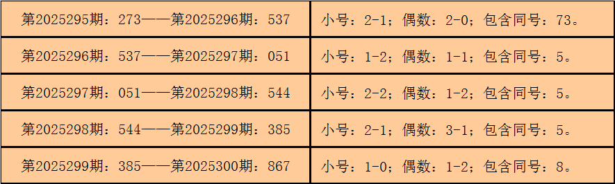 统计3D历史上已开出的奖号发现,在连续5期开奖号码中:3D在第2025295期-第2025299期分别开出奖号:273-537-051-544-385。