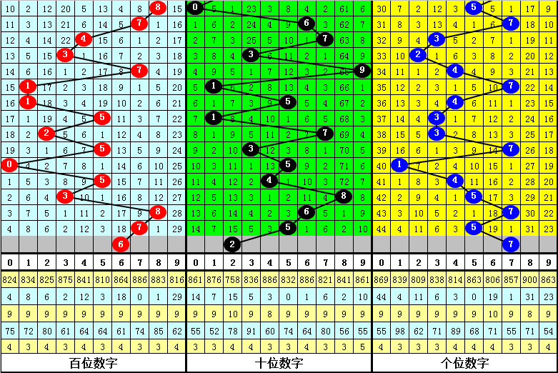 百位分析:上期百位开出奖号:7,最近9期该位奖号大小比为5:4,其中大号5出现3次,7、8出现1次,6、9出现0次,小 号0、1、2、3出现1次,4出现0次,本期百位参考大号,胆码关注6。