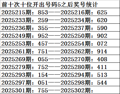 一、上期开奖:福利彩票3D第2025301期奖号为755。奇偶比为3:0,大小比为:3:0,奖号和值为17,奖号跨度为2。