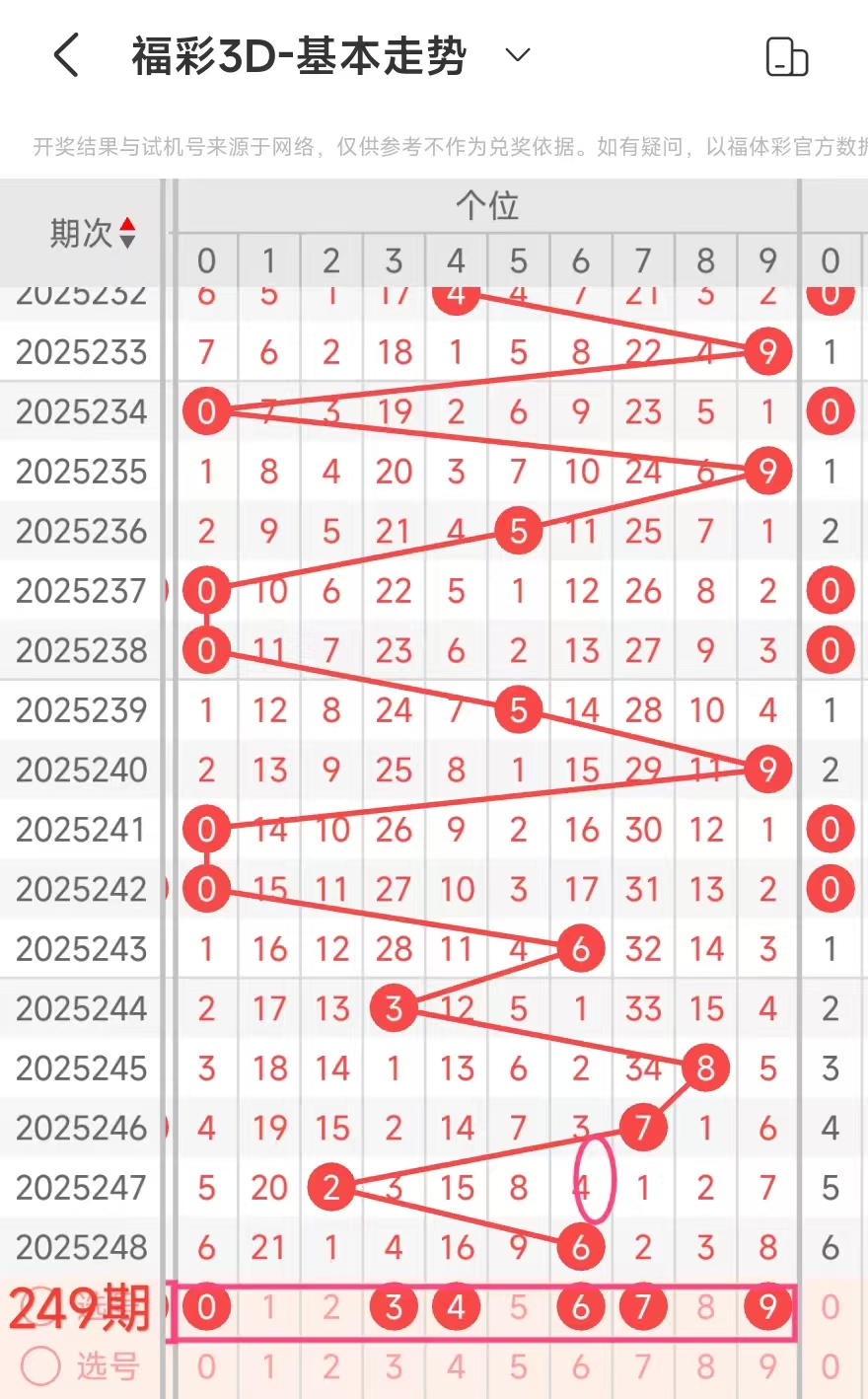 3、当个位开出6后下期开出:72286031060003,经统计0号出4次、1号出现1次、2号出现2次、3号出现2次、4号出现0次、5号出现0次、6号出现2次、7号出现1次、8号出现1次、9号出现0次。观察发现0236号出现靠前优先选。