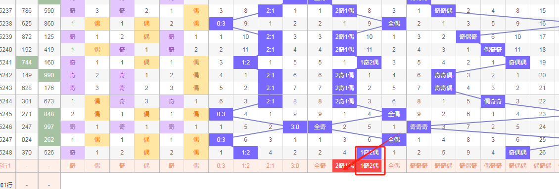 如图所示,上期开1奇2偶,个位为偶,开二期,十位为偶开二期,百位为奇偶开一期,比例1:2,本期推测1奇2偶增重,防2奇1偶顺位分边,个位为奇13579,十位为偶02468 百位为奇13579, 大小比,奇偶比我们已经研测完毕,下面研测本期码数: