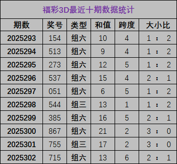 开奖回顾:福彩3D上期开奖号为715,和值为13,跨度6,其中奖号大小比为2:1