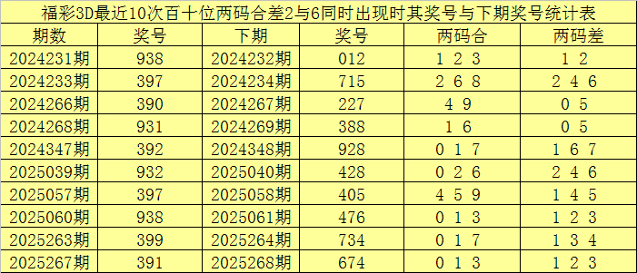 从以上统计可以看出,百十位两码合差2与6同时出现之后其下期两码合差表现最热的4个分别为:0123,本期百十位两码合差可以参考这四码中的数据。