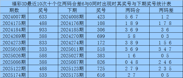 从以上统计可以看出,十个位两码合差6与0同时出现之后其下期两码合差表现最热的4个分别为:1356,本期十个位两码合差可以参考这四码中的数据。