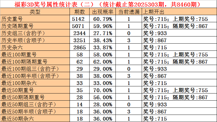 福彩3D第2025301期奖号为755,第2025303期奖号为933,隔期奖号没有出号。从统计表中分析,最近100期隔期奖号出现62期,出现比例为62%,最近50期隔期奖号出现28期,出现比例为56%,最近10期隔期奖号出现 6期,出现比例为60%,本期防止隔期号中号码轮空。