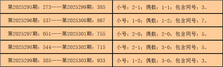 统计3D历史上已开出的奖号发现,在连续5期开奖号码中:3D在第2025295期-第2025299期分别开出奖号:273-537-051-544-385。