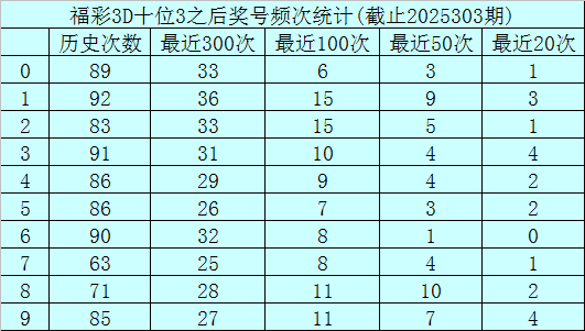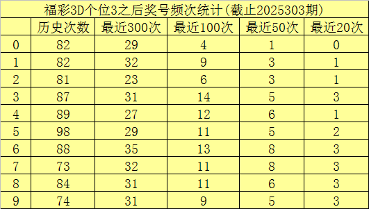 个位杀号:上期个位奖号为3,历史上个位奖号3共开出839次,最近100次个位奖号3出现时,其下期号码0-9开出次数分别为:奖号3开出14次,6开出13次,4开出12次,5、7、8开出11次,1、9开出9次,2开出6次,0开出4次。