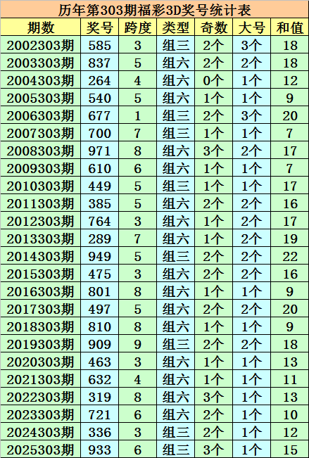 在以上奖号中奖,历年第304期福彩3D出现6次组三,出现17次组六。组六开出比例较高,本期继续关注组六。
