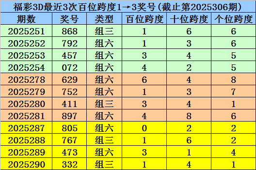 首位跨度分析:首位号码最近3期奖号为4-3-6,连续两期跨度为1、3,历史上首位号码连续两期分别开出跨度1、3的现象共出现219次,其前两次开出奖号分别为: