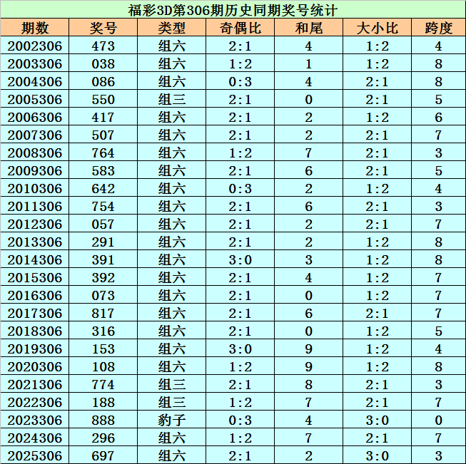 福彩3D历年第306期同期奖号为:473 038 086 550 417 507 764 583 642 754 057 291 391 392 073 817 316 153 108 774 188 888 296 697。