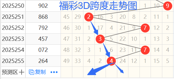 依次是27374跨度,按照路数转换关系来看,那么跨度我们暂定258369跨,本期个人比较看好5 2 6跨。
