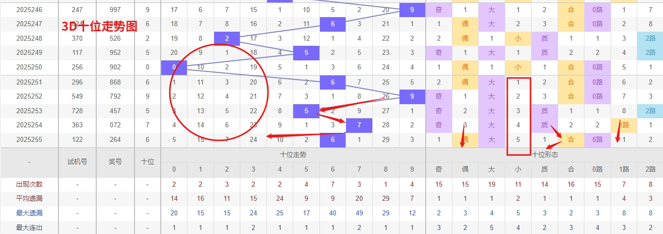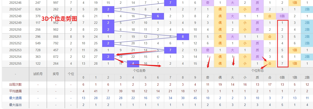 福彩3D个位分析:第2025255期个位开出号码4属于小偶数前端,从以上个位走势图中可以看出近100期的大小比约为46:54奇偶比约为52:48大小奇偶数据上有点差异有需求但不是太明显,不太好看这时就要借助连线走势和遗漏数据来帮助我们缩水号码。上期个位落号“4”小偶数1路号码球,号码开出了2振幅,连续多期的大振必被小振幅取代幅符合我们的预期,那么本期我们在个位考虑振幅走势走前依然要转变思路考虑大振幅,具体考虑(2-5)个振幅是我们主要的方向,那么在对个位落号情况进行系统的分析时我们可以明显的看到个位号码走势呈现大范围震荡,尤其是在号码的落位特点上表现的尤为突出,那么本期我们在个位分析时就要注意号码的风险,避免出现踏空。从近期3D个位走势分析,数字1和6已进入明显的冷态周期,遗漏期数持续延长,根据概率均衡的规律,其回补的需求正不断增强。尤其是个位号码通常具有较强的随机性和周期性,冷号一旦开始回补,往往会出现连续或间隔较短的开出态势,因此对1和6需要给予高度重视。不过,冷号的具体反弹时机仍需结合整体走势判断,与此同时,虽然未明确提及热号,但需注意在冷号回补过程中,个位其他温号或热号可能短暂维持热度,形成冷热交替的格局。采取重点跟踪冷号回补,因此福彩3D第2025256期个位看好56189。