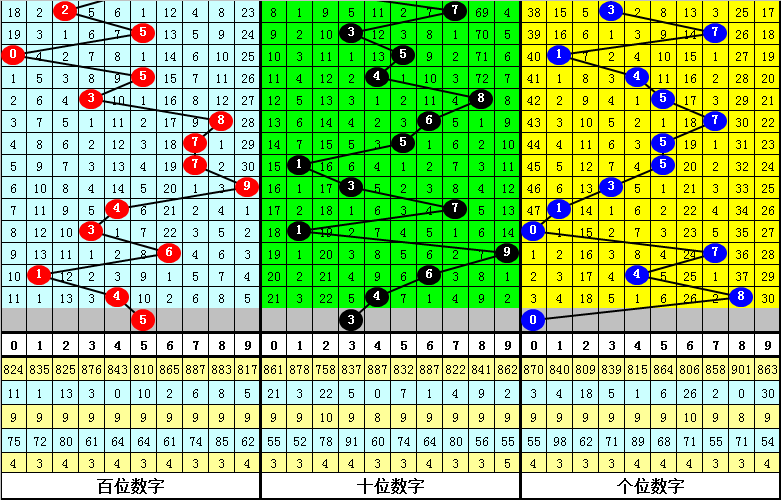跨度分析:最近周三跨度出现范围在1-9区间,跨度比较集中,上周三跨度为6,跨度上升了1个点位,本期预计跨度下降,参考跨度5。
