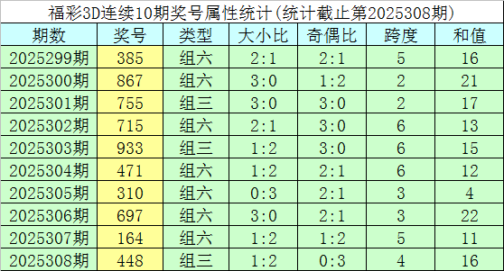 开奖回顾:福彩3D第2025308期奖号为448。奖号形态为组三,大小形态为小小大,奇偶形态为偶偶偶,和值为16,跨度为4。