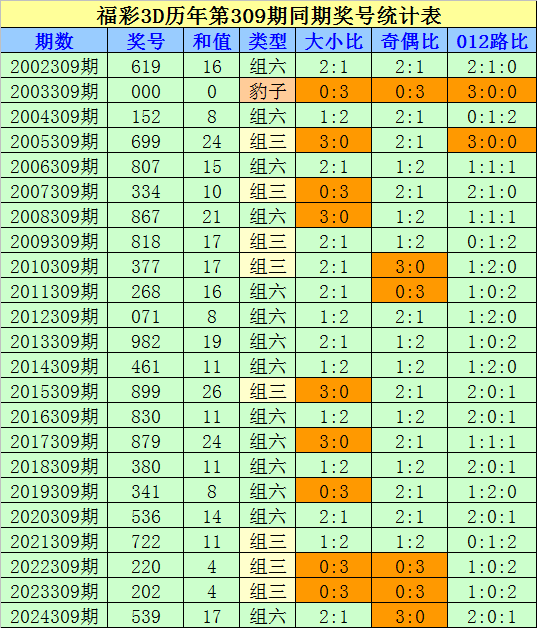 组选类型判断:在第309期历史同期开奖中,组六开出14次,组三开出8次,豹子开出1次,今年同期看好开出组六号码。