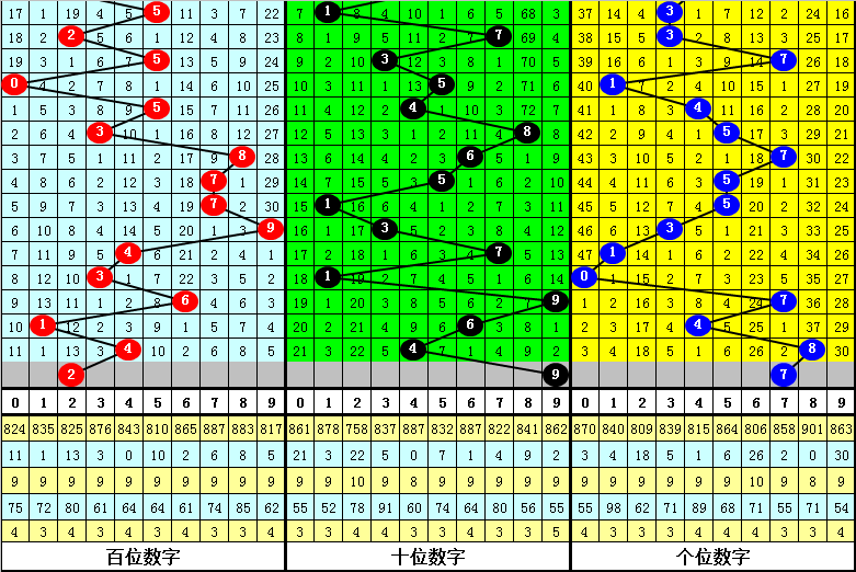 百位上期开出号码4,上升3点位,本期注意该位下降,参考号码2。
