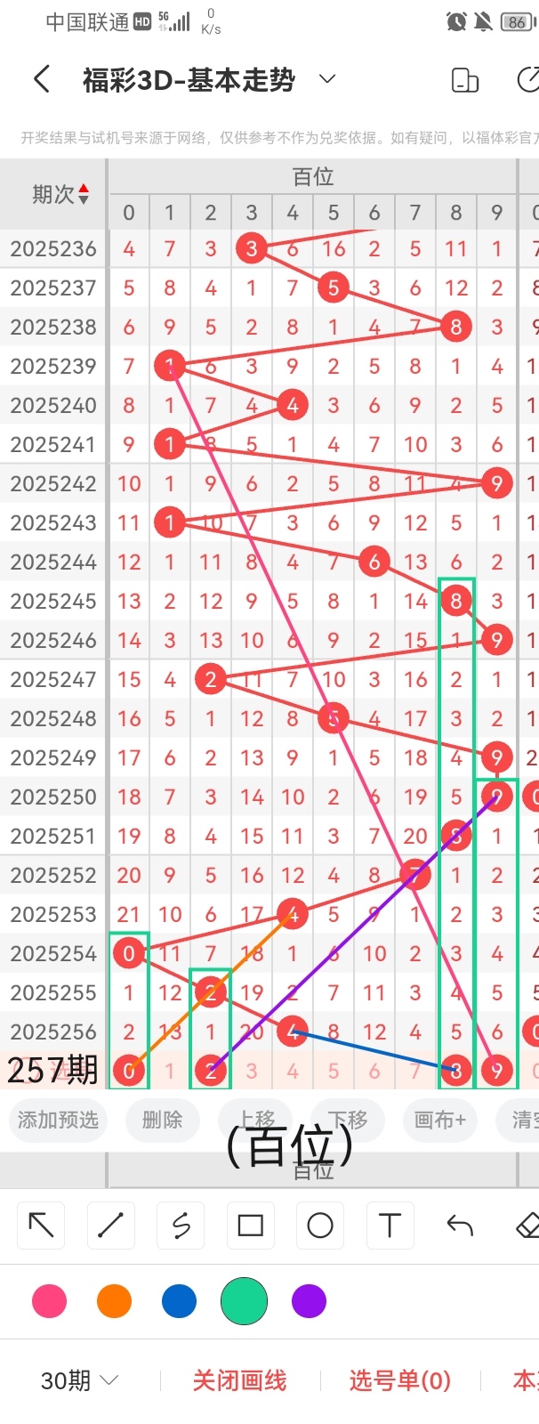 首先,小梁给大家分享每期福彩3D杀一百位:4;准确率高达95.36%。其次,我们根据图中画线的思路可以看出,号码0与前几期开出的号码呈斜三连的走势且呈隔两期回补的走位,跨度为4;号码2与前几期开出的号码呈隔期回补的走位且呈斜四连的走势,跨度为2;号码8与前几期开出的号码呈斜连的走势且呈连续隔五期回补的走位,跨度为4。然后,如图所示,号码9与前几期开出的号码呈斜三连的走位且呈隔六期回补的走势,跨度为5。综上所述,小梁推荐百位的号码:0、2、8、9。