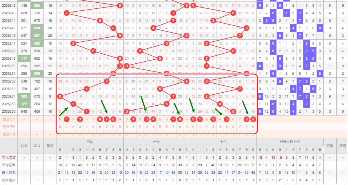 在最近的5期当中百位大数出现的频次1次 小数出现4次 ,从图上来看本期百位出号走大,大家注意防守配号