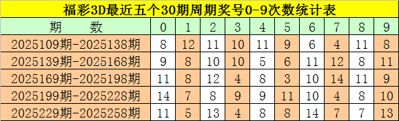 大小分析:在上一个30期周期内(第2025199期-第2025228期),奖号大小比为43:47,大号出现频次较低;在但前30期周期内(第2025229期-第2025258期),3D开奖大小比为49:41,大号走势相对活跃。大号最近2期走势相当活跃,本期预计再次走热,看好开出全大组合。