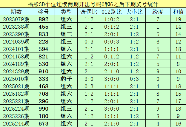 个位号码:最近两期个位开出号码为0-6,在福彩3D历史开奖中,前后两期个位分别开出号码0-6的奖号出现了86次。最近15期个位0-6组合出现之后,其下期奖号分别为:892-455-833-228-594-821-530-910-333-468-708-296-990-180-673;