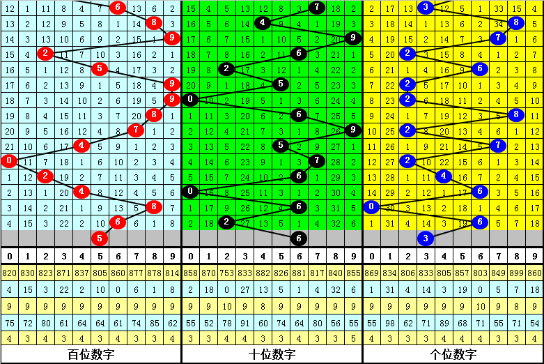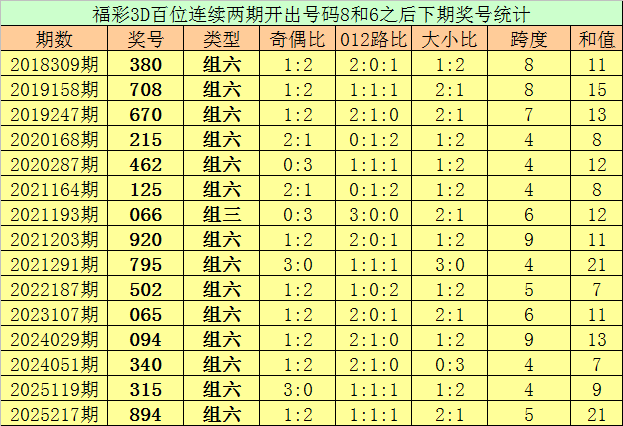 百位号码:连续两期百位出号分别为:8-6,历史上福彩3D连续两期前后分别出号8-6的奖号共出现79次。在百位8-6的奖号现象出现时,近15期下期分别出号:380-708-670-215-462-125-066-920-795-502-065-094-340-315-894;