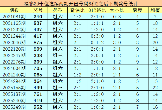 十位号码:前两期十位分别出现奖号6-2,历史上福彩3D连续前后分别开出号码6-2的现象共开出73次。在十位6-2的现象出现时,最近15期其下期分别开出号码:340-837-437-417-875-509-338-309-705-065-364-499-761-419-952;