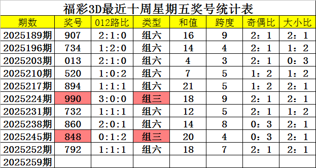 奖号类型分析:从近期周五开奖数据分析,组六近期热出,十周内出现8次,上周五为组六号码,组三出现2次,表现相对较冷,本周五预计继续开出组六号码。